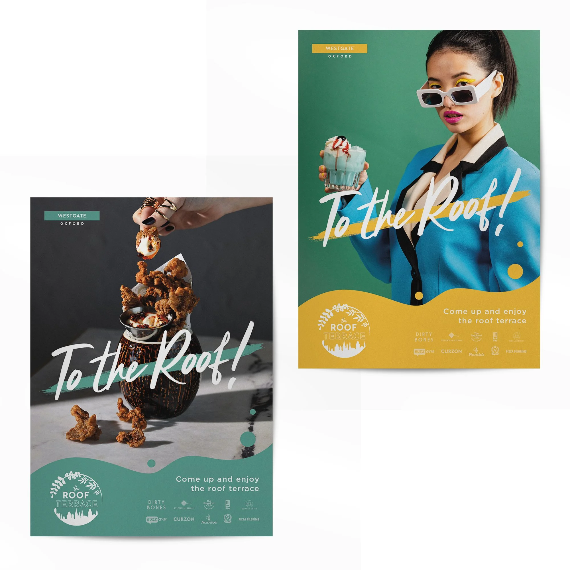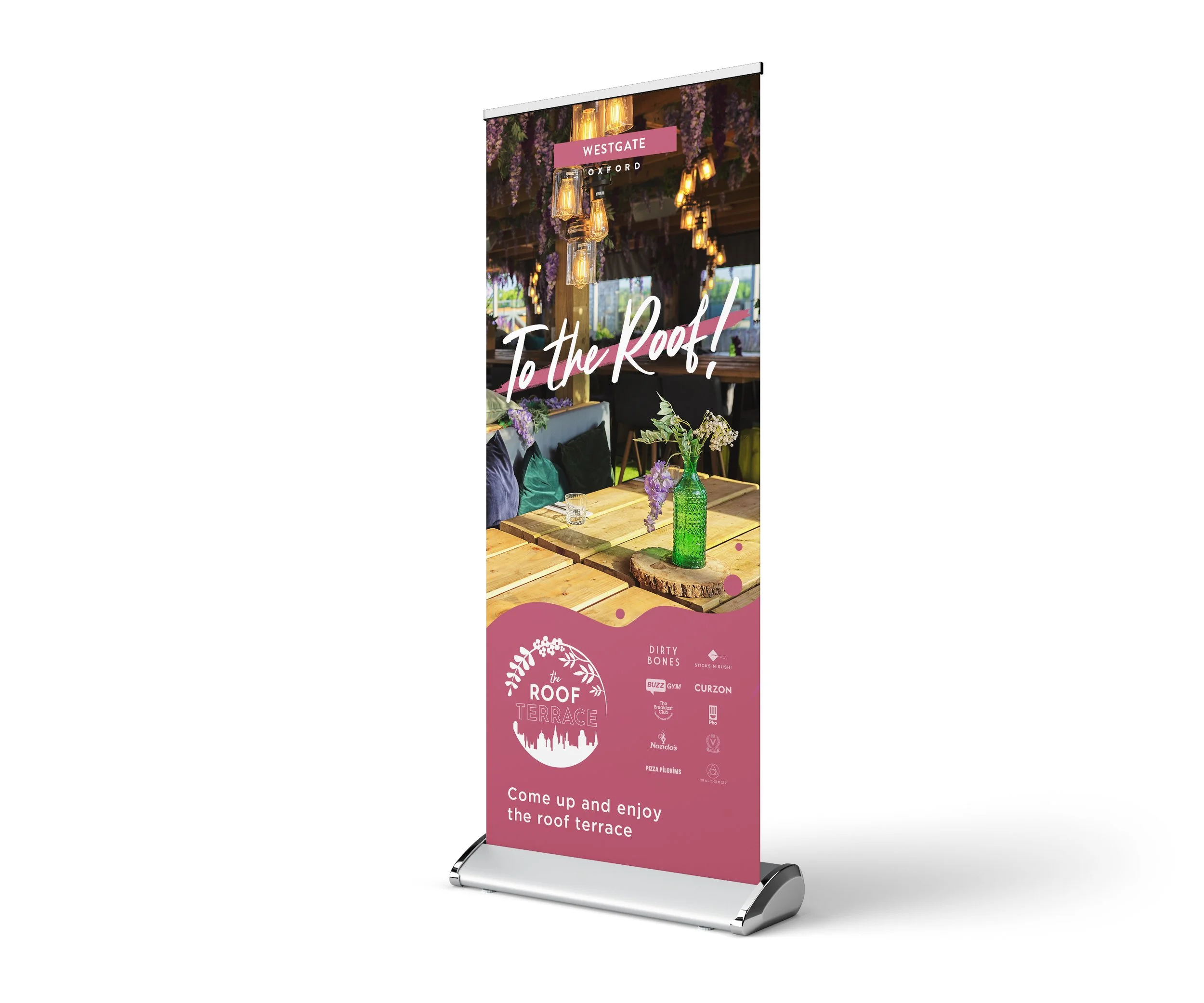 Rebrand project for the roof terrace of a shopping centre. The challenge with this was to incorporate the existing branding of the shopping centre while incorporating the Oxford skyline and characteristic wisteria in a clean and modern way. The logo includes both the wisteria and skyline and is versatile enough to be used on all deliverables. The Print assets have a recognisable guest font and the block colour at the bottom is a subtle nod to the seating found on the roof terrace